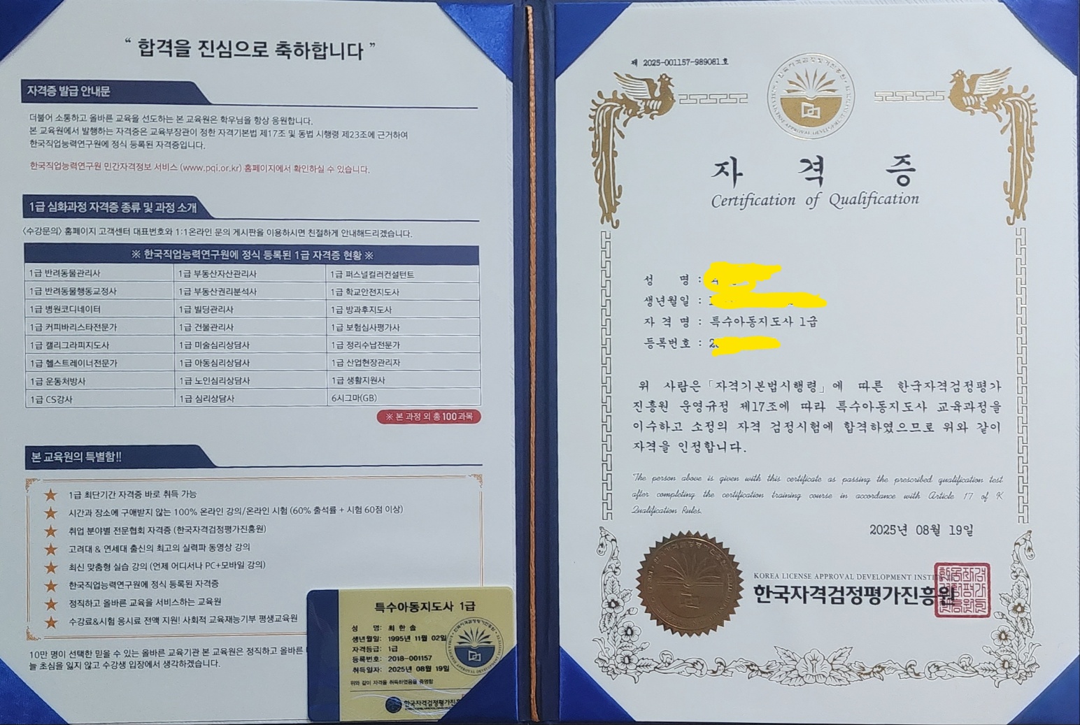 "처음 유튜브에 뜨는 광고?에 무료로 들을 수 있다" 라고 해서 진짜 무료로 들을 수 있나? 라는 생각을 하면서 홈페이지에 들어와 봤고 예전부터 들어보고 싶어하던 "특수아동지도사"가 강의로 있길래 듣게 되었습니다. 강의 내용도 이해 하기 쉽게 가르쳐주시고 무엇보다 원하는 시간에 직장이나 카페에서 핸드폰이나 컴퓨터로 강의를 들을수도 있고 시험을 볼 수 있어서 제일 좋았습니다. 다른 자격증도 많이 듣고 취득하고 싶습니다.