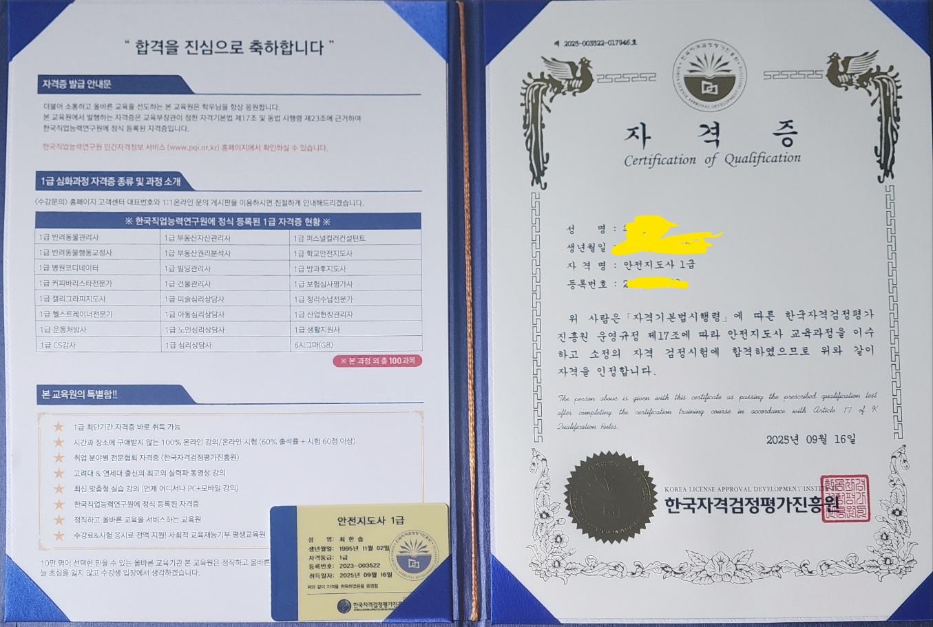 홈페이지에서 어떤 강의를 들어볼까 하다가 "안전지도사"라는 직업에 관심을 가지게 되어 강의를 듣고 자격증을 취득하였습니다. 강의가 알기 쉽게 설명을 해주고 어디에 있든 핸드폰만 있으면 들고 시험을 볼 수 있는게 좋았습니다.