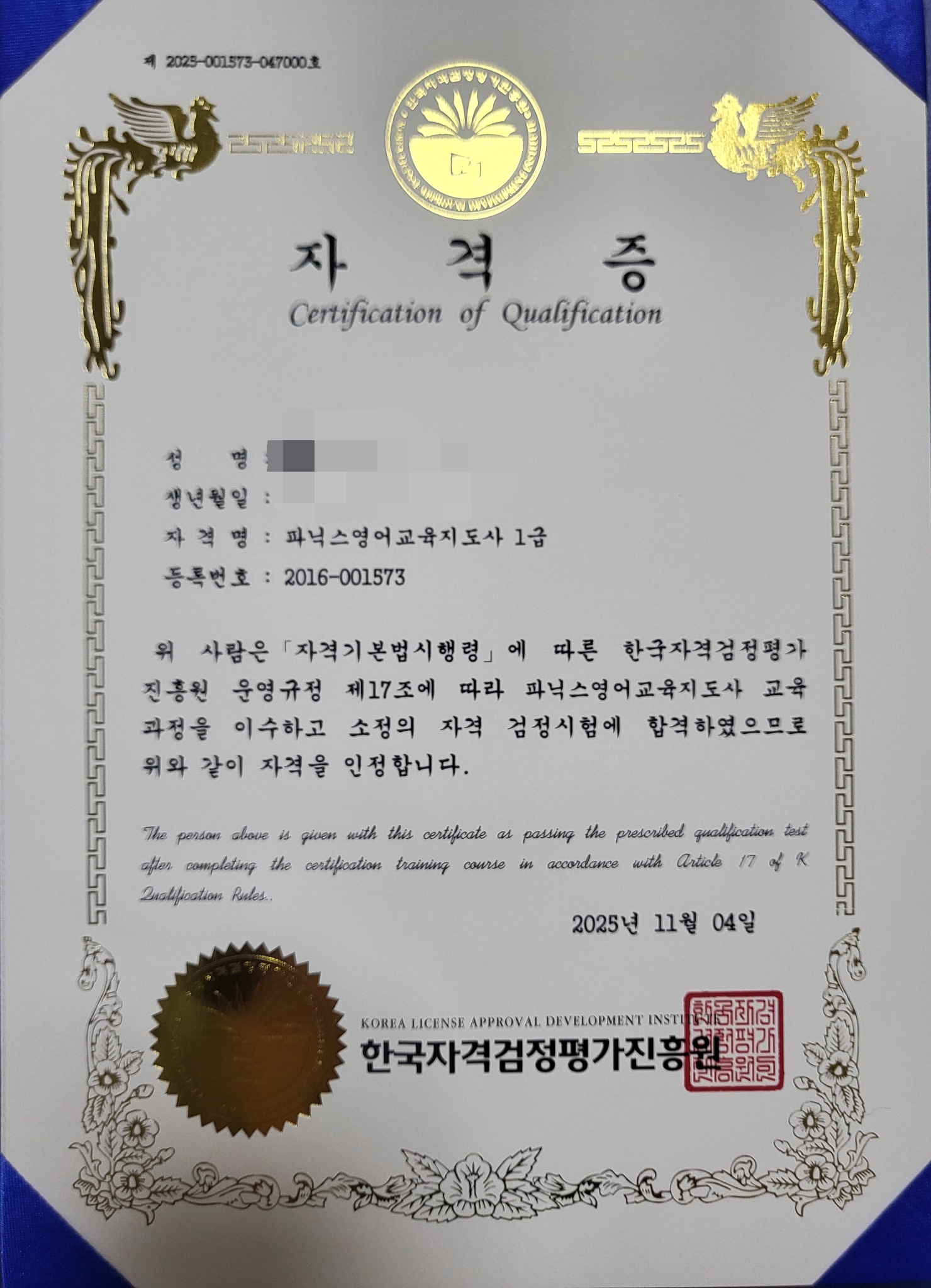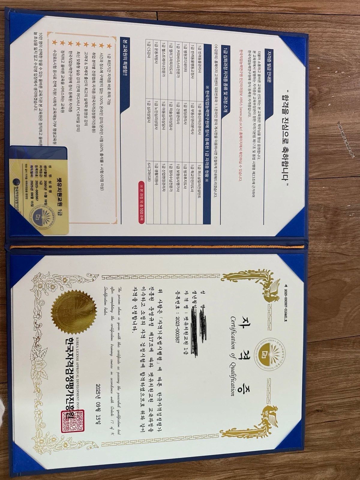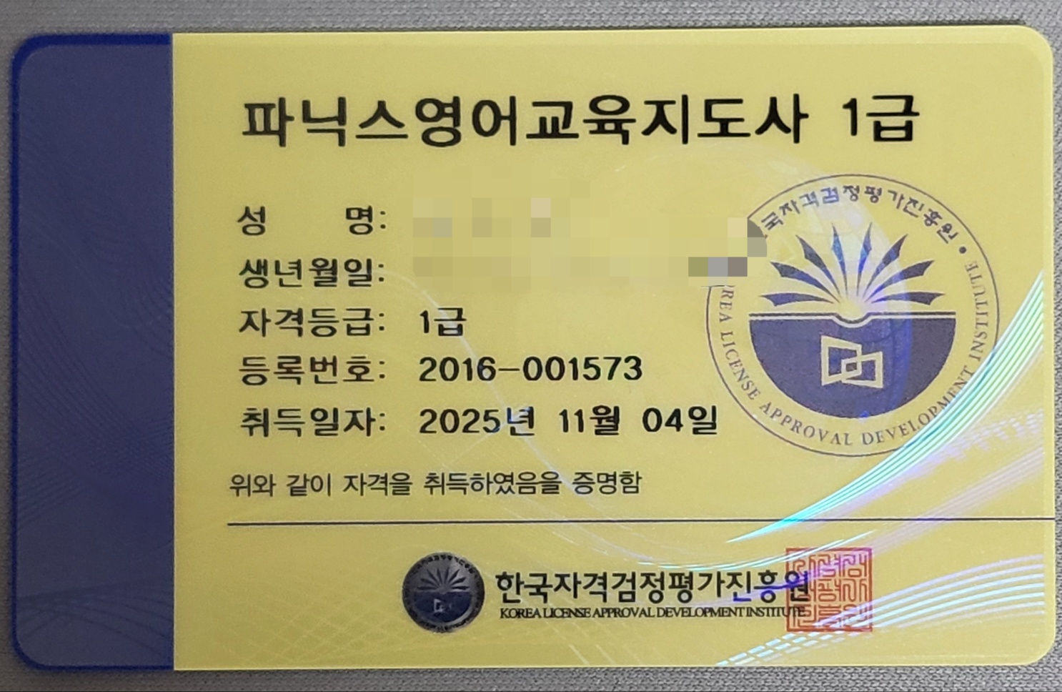 영어지도 관련 자격증을 보유하고 싶어 여러 사이트를 알아보던 와중에 KNCA가 제일 마음에 들었습니다. 다른 자격증 공부도 더 하고 싶은 과목이 많지만 제일 먼저 기초적인 파닉스영어교육지도사를 먼저 공부하고 첫 자격증을 따게 되었네요. 온라인 강의라 시간 날 때 틈틈이 수업 들으니 자격증 따는데 까지 그리 오래 걸리지도 않았습니다. 영어 관련 자격증을 국민자격증인증협회 덕분에 보유하게 돼서 너무 뿌듯합니다.