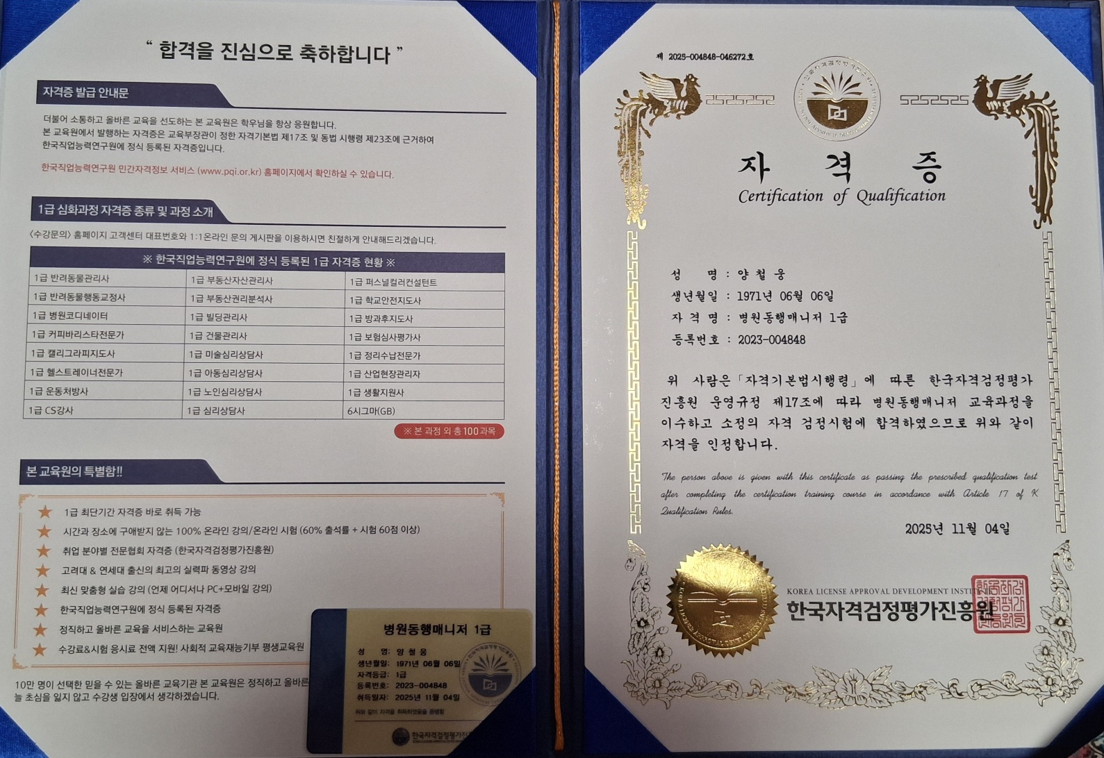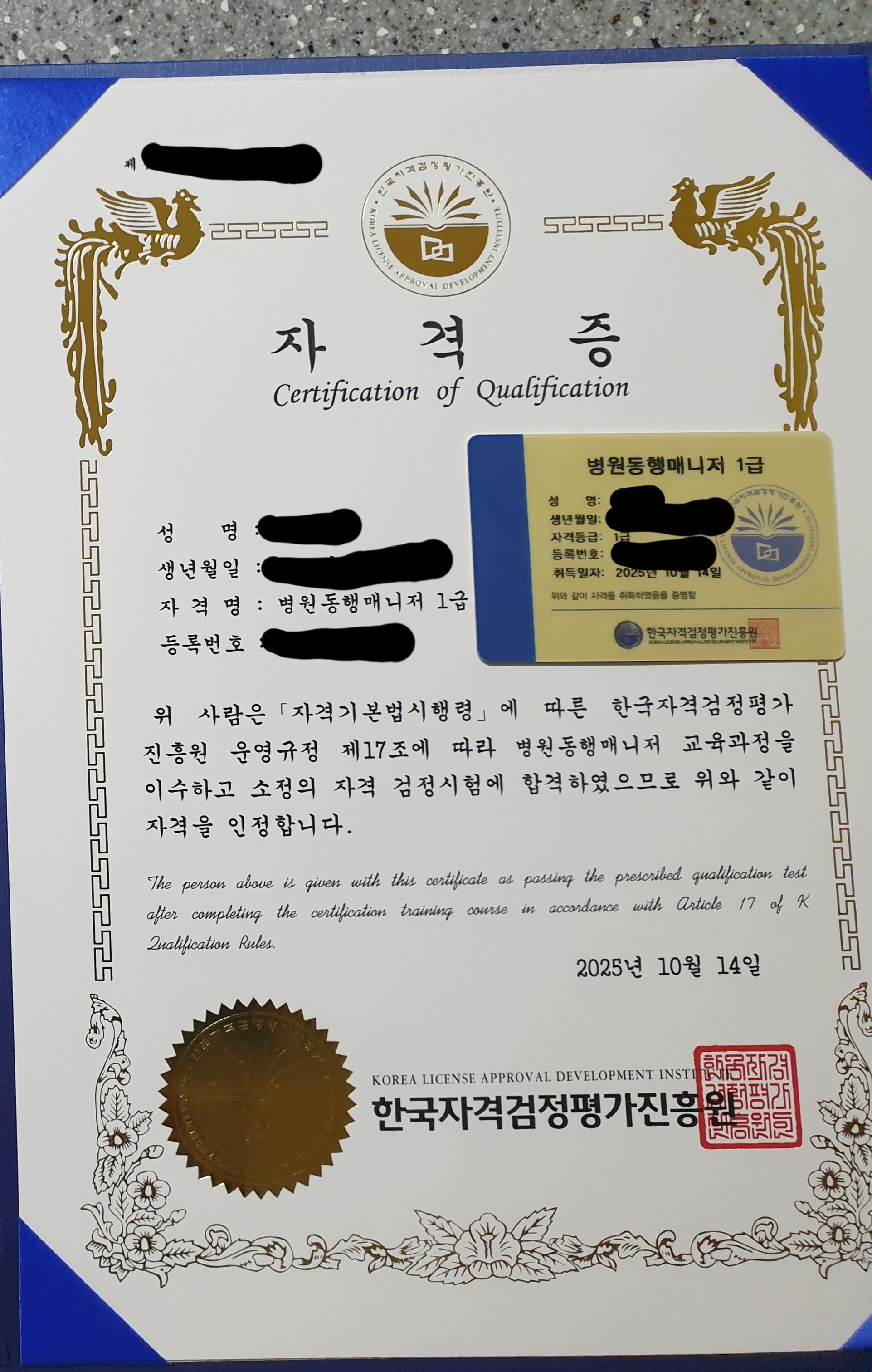 병원동행 매니저 1급 자격증 취득 너무 감사합니다.