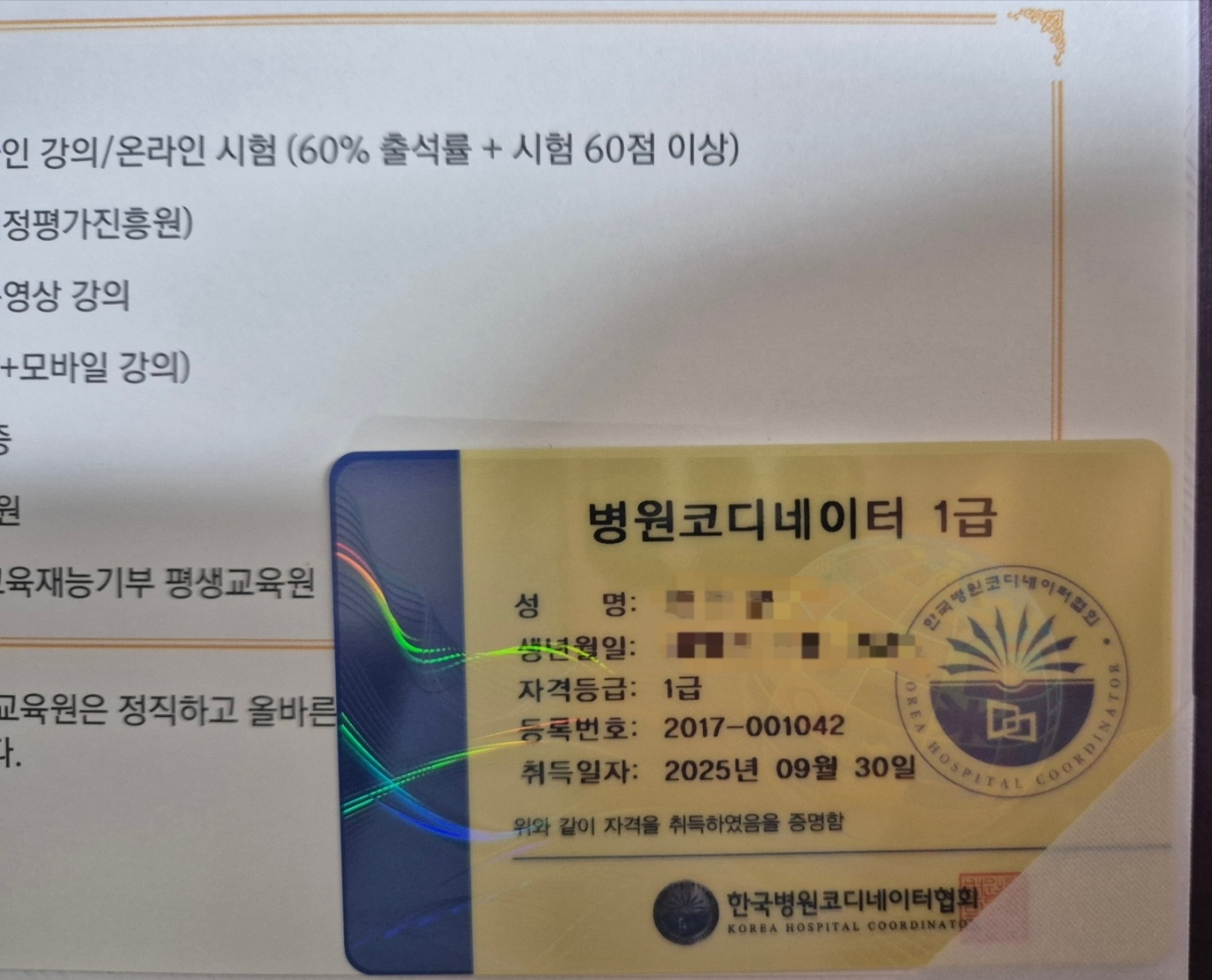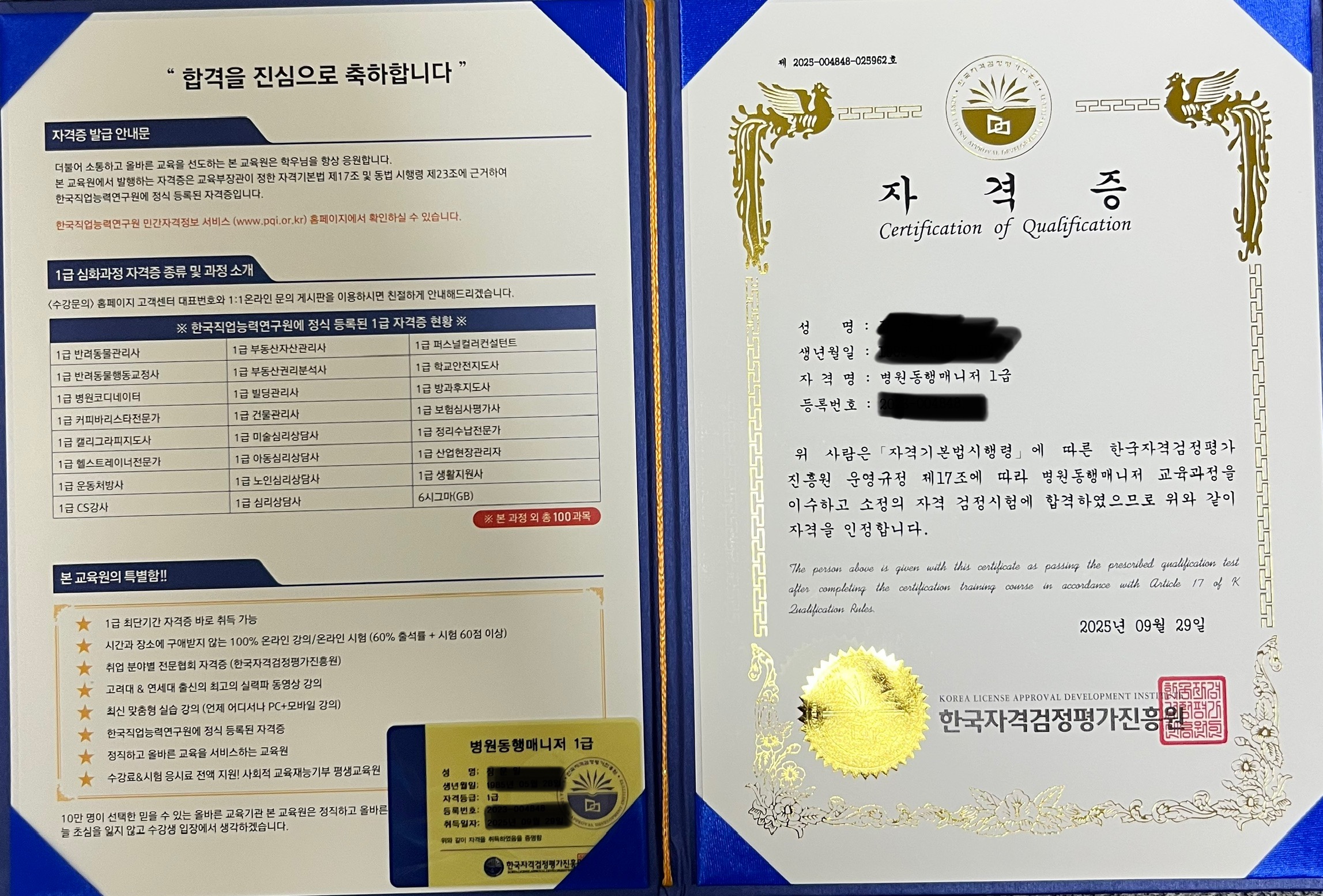 병원동행매니저1급 자격증시험 도전성공!! 강의 내용도 알차고 이해 하기 쉽게 가르쳐주시고 기출문제도 함께 볼 수 있어서 너무 좋았고 무엇보다 원하는 시간 어디서든 핸드폰만 있으면 강의 듣고 시험을 볼 수 있는게 제일 좋았습니다. 다른 자격증 많이 취득하고 싶습니다