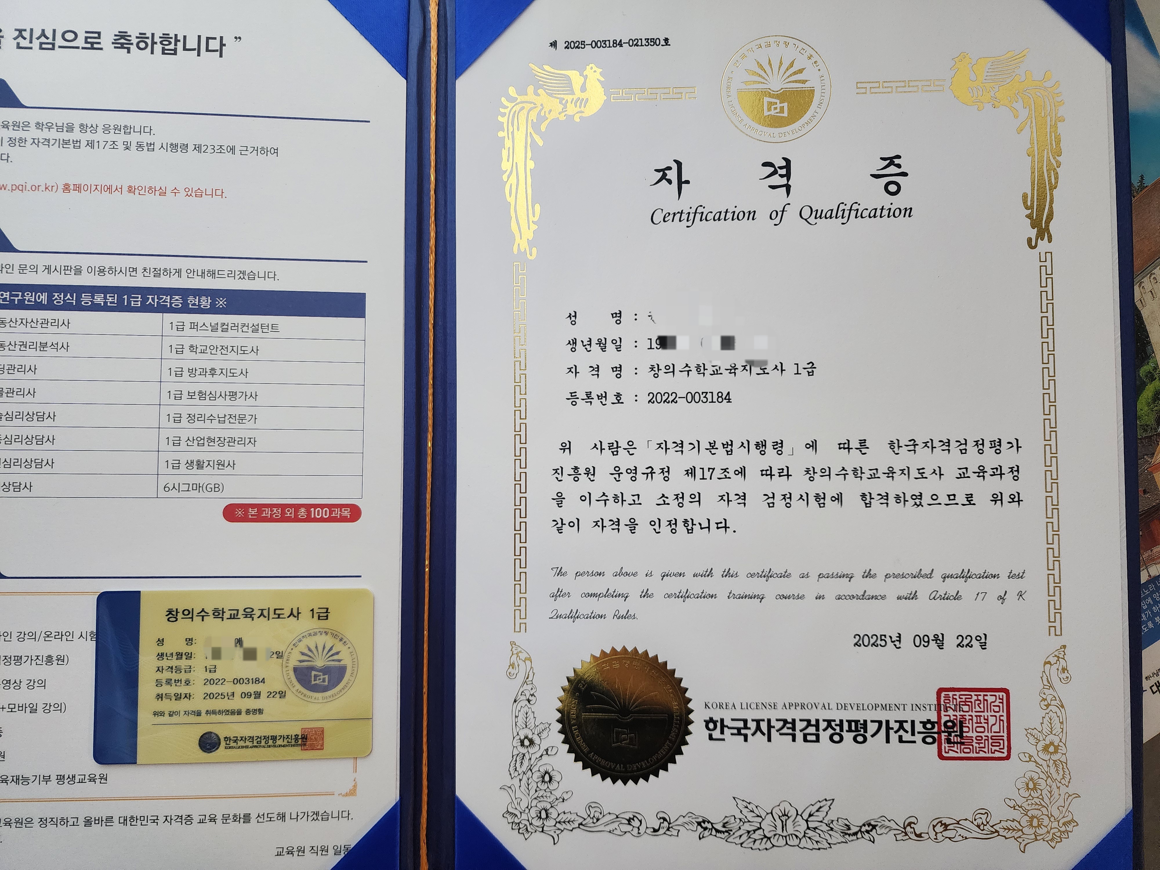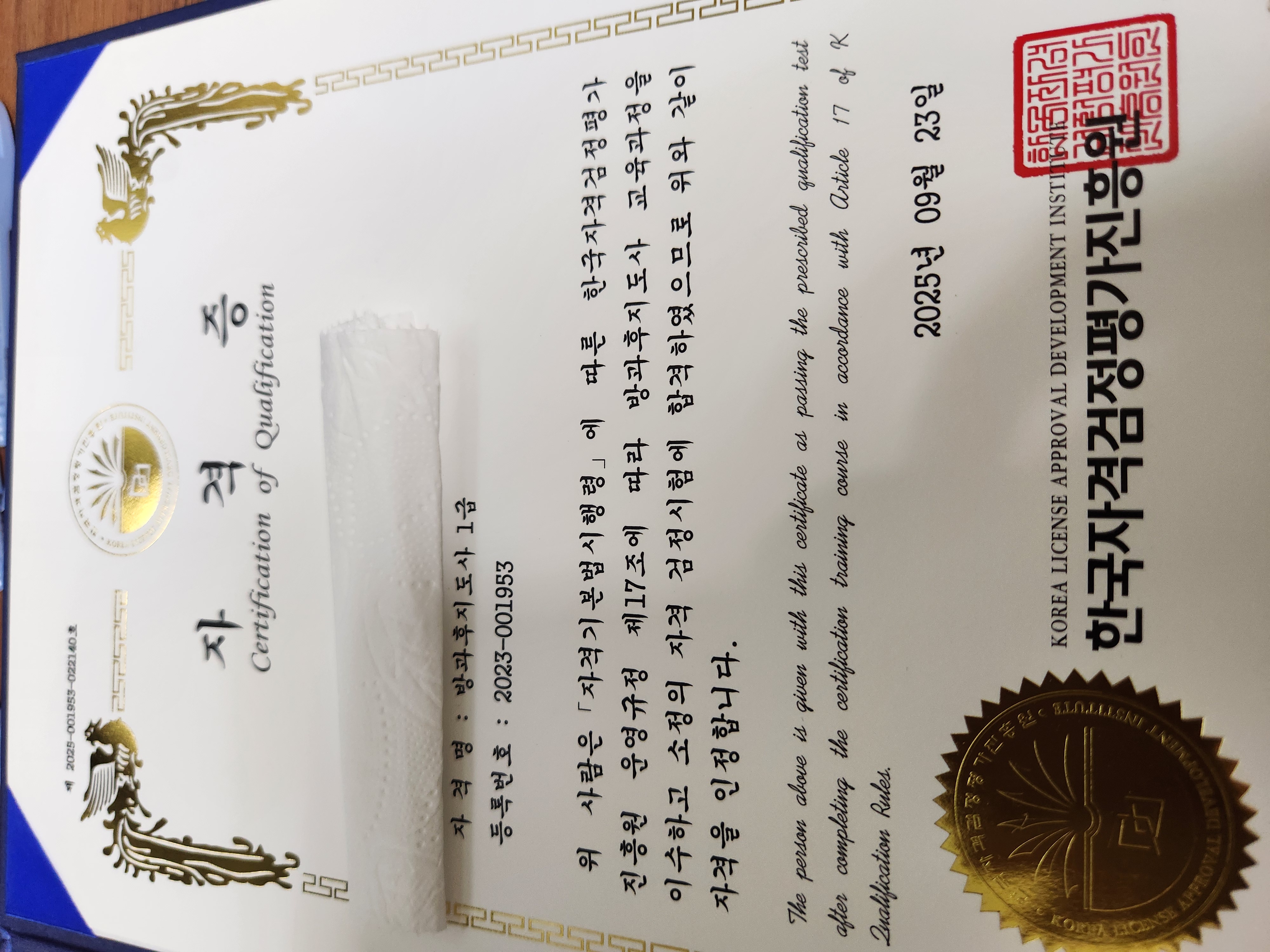 작년에 방과후지도 일자리 신청중 지도사 자격증이 있느냐는 질문에, 개인적인 과외나 지도같은 경험보다는 자격증의 중요함을 깨닫고 늦은 나이지만 도전하여 체계적이고 이해하기 쉬운 강의 덕에 재미있게 공부하였습니다. 덕분에 어렵지않게 자격증을 취득 하였습니다. 나이보다는 하고자하는 의지나 도전이 중요한거 같습니다 합격 할 수 있게 도와주신 협회에 감사드립니다.