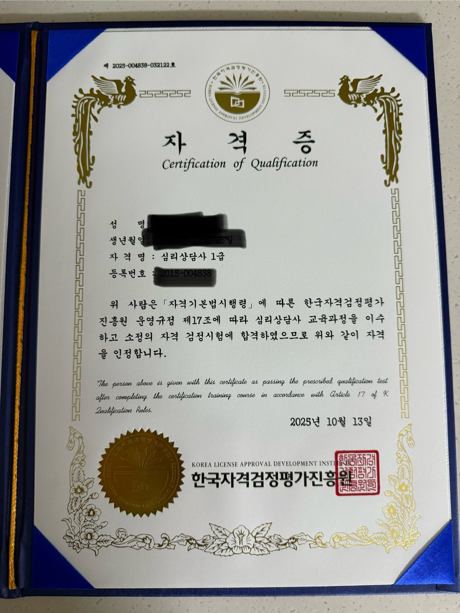 관심 있는 분야를 찾다가 자격증 취득도 할 수 있다고해서 신청하고 수강했어요~ 시험도보고 드디어 자격증이 도착했어요! 감사합니당ㅎㅎ 다른 분야도 또 수강할게요!^♡^