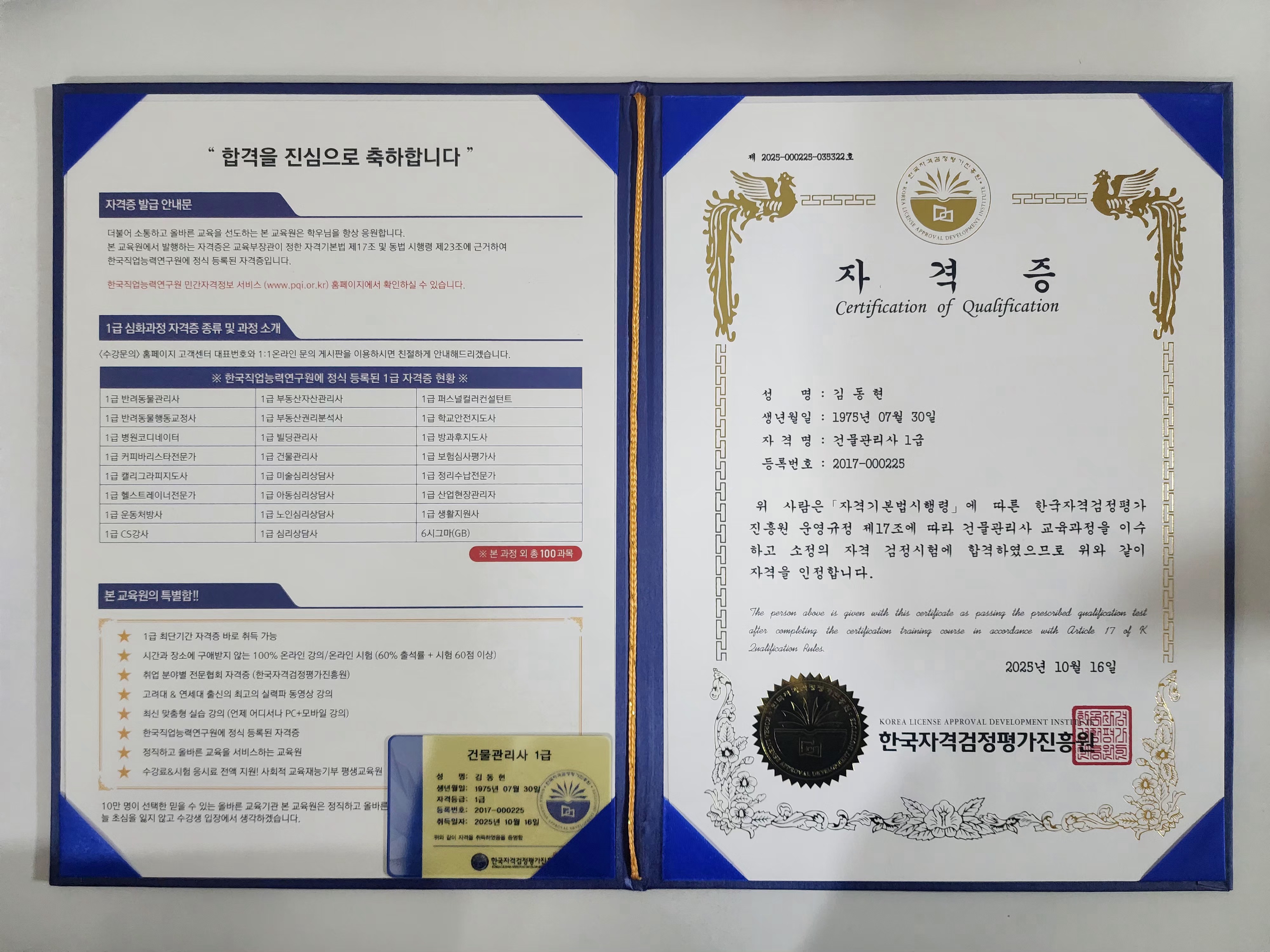 처음 자격증 한번 따보는거 어때 권유 받았을때 그럼 학원도 다녀야하는데 일하면서 학원 다닐 시간도 여유도 재정적 어려움도 있어서 고민 하다가 우연히 알게 되어서 긴가민가 하면서 시작했는데 수업 강의를 내가 편한 시간에 보고 공부 할 수 있고 교재와 기출까지 있어서 공부에 도움을 많이 받았어요! 덕분에 2주만에 합격 할 수 있었습니다, 너무 뿌듯하네요!!